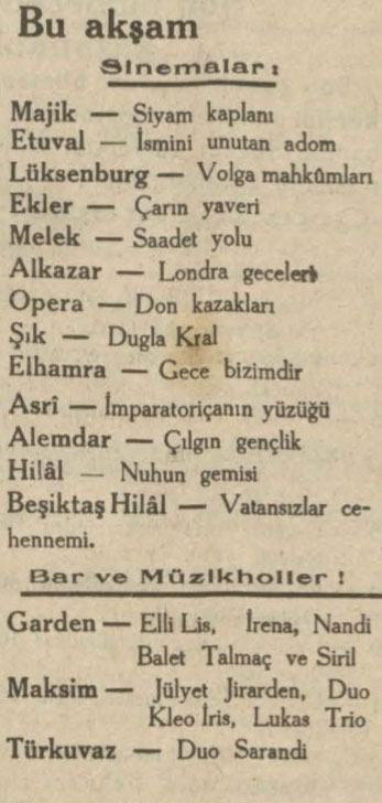 Nuri Akbayar, “Sinemalar”, Dünden Bugüne Beşiktaş, ed. Nuri Akbayar (İstanbul: Tarih Vakfı Yayınları, 1998), 277-278.